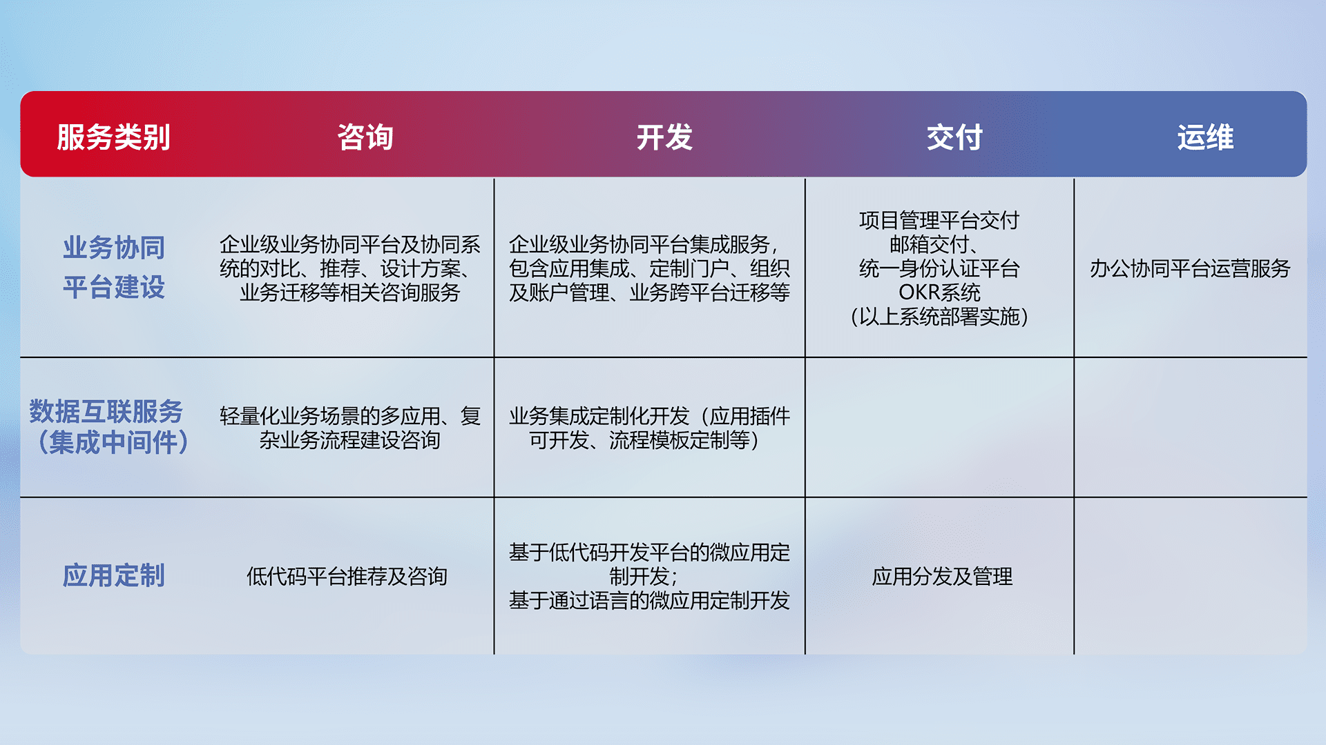 针对钉钉、、、、企微、、IDaas等平台级产品提供产品的规划、、、、方案、、、交付、、定制化开发等服务,,,,实现如统一协同办公、、、、智能客户服务、、、混合会议管理、、、智能数据查询、、等业务场景,,,实现数字化转型。。。。