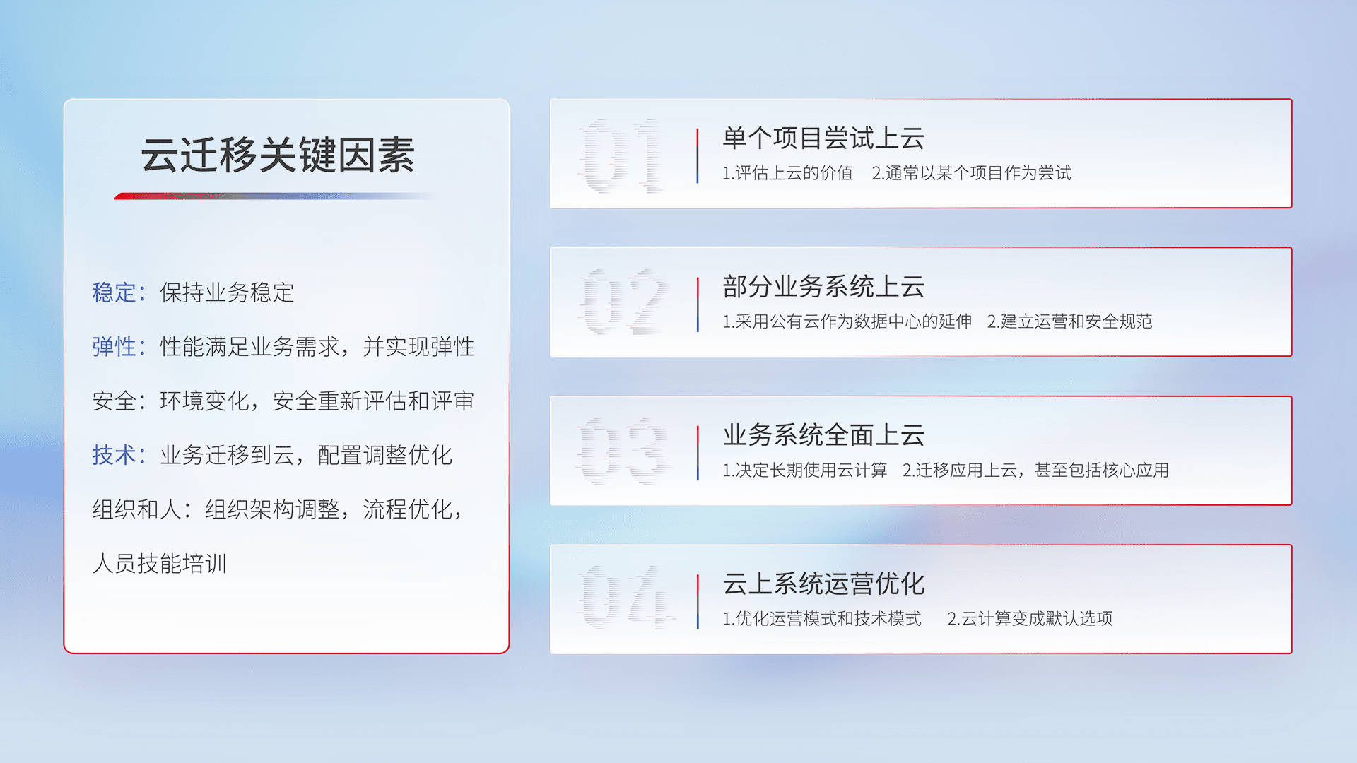 结合实际业务,,从规划设计、、、、云平台选型、、、云原生改造、、、数据迁移、、、、集成交付,,迁移全过程为客户识别最佳上云路径,,,,做好风险识别管理,,,,设计网络架构、、身份权限、、、安全审计合规、、、操作审计、、、、日志审计、、、、监控告警策略、、、、多站点容灾设计等,,,,对云上基础设施进行整体规划,,提升IT治理水平,,以满足弹性、、、、高可用、、、高性能的需求。。