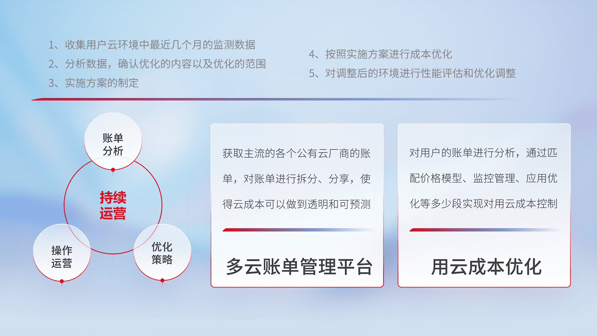 通过多云纳管,,,,以统一的资源数据模型把客户的云资源进行抽象和封装,,进而实现对多云资源的统一操作,,,保障云资源管理的可靠性、、稳定性与可用性。。。量身定制化运维内容,,,,配置、、开发运维、、、、补丁管理、、备份、、监控、、、、认证和访问管理、、审计和日常巡检等,,,保障在用云过程中的可靠度,,,,稳定度以及高可用率。。。。